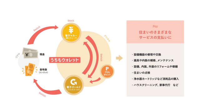 「うちもウォレット」は、住宅オーナーが抱えるメンテナンスの課題を解決する住まい特化型のデジタルウォレットサービス。修理や点検費用といった住まいの維持費を電子マネーで計画的・継続的に積み立てられ、電子マネーのチャージや有料サービスの利用でポイントをもらうことができる。また、積み立てた電子マネーや貯まったポイントは「電子ゴールド」(スイッチゴールド)に交換できるため、長期的な資産形成にも役立てられる。貯まったスイッチゴールドは、金現物に交換できるほか、各種サービスへの支払いにも利用できる。