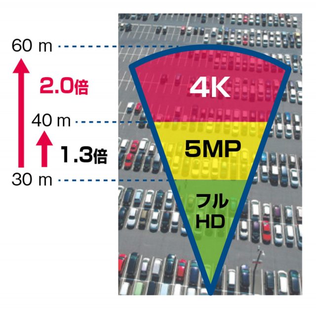さらに4K解像度を活用することで、従来は複数台のカメラで行っていた撮影範囲の画像解析を1台で行ったり、小さい対象物の画像解析が可能になる。対象物までの距離は従来比で約2倍。屋外機能も充実している。