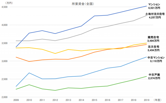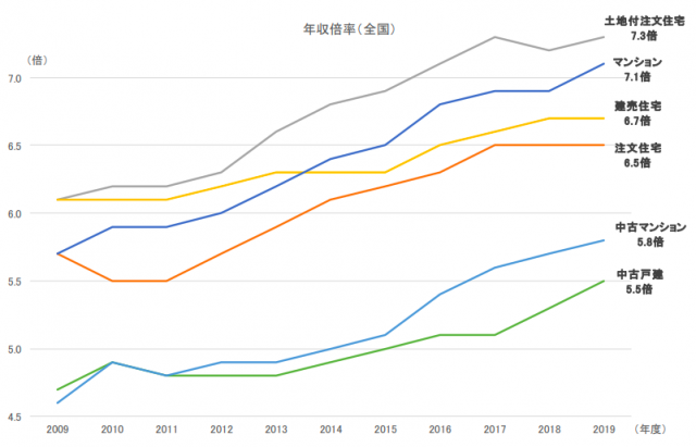 所要資金は、全ての融資区分(注文住宅・土地付注文住宅・建売住宅・中古戸建・マンション・中古マンション)で上昇。年収倍率は、注文住宅(6.5倍)と建売住宅(6.7倍)で前年度比横這い、土地付注文住宅(7.3倍)、マンション(7.1倍)、中古マンション(5.8倍)、中古戸建(5.5倍)で緩やかな上昇が続いた。