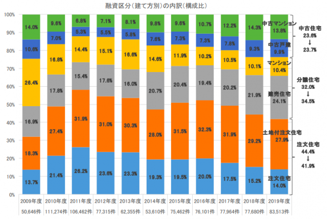 住宅金融支援機構(東京都文京区)は8月4日、 2019年度「フラット35利用者調査」の結果を発表した。取得住宅の内訳では、建売住宅の割合が3年連続で増加して24.1%となり、2004年度の調査開始以来最多を記録した。