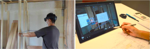 現場担当者の目の前には設計士からの指示や設計図をはじめとした関連資料が実空間上に提示され、オフィス側の設計者は高解像度の現場映像が確認できる。これにより、今まで生じていた確認箇所や作業指示に関する認識合わせの難しさの解消を目指す。