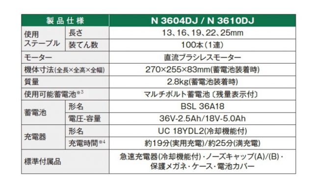 また、独自のリチウムイオン電池「マルチボルト蓄電池」とブラシレスモーターにより1秒間に4本以上の打ち込みが可能。思い通りの位置・深さで打つことができ、2種類のノーズキャップにより用途に合わせてきれいな仕上がりが得られる。