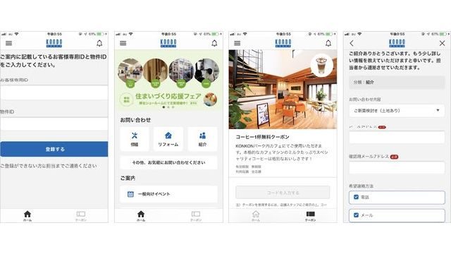 導入第1号として、近藤建設(埼玉県ふじみ野市)の「KONDO Group オーナーズアプリ」を8月7日から提供。「KONDO Group オーナーズアプリ」には、定期点検の通知を自動配信する機能や、オーナーからの修繕・リフォーム・紹介などの問い合わせを担当部署にダイレクトに連絡する機能のほか、個人向け住宅と合わせて事業者向け建物も扱っている近藤建設の強みを活かし、建物に入居する事業者のクーポンをアプリ内で発行する機能も搭載している。また、アプリの利用促進コンテンツとして、運営するウェブメディアの情報も配信する。