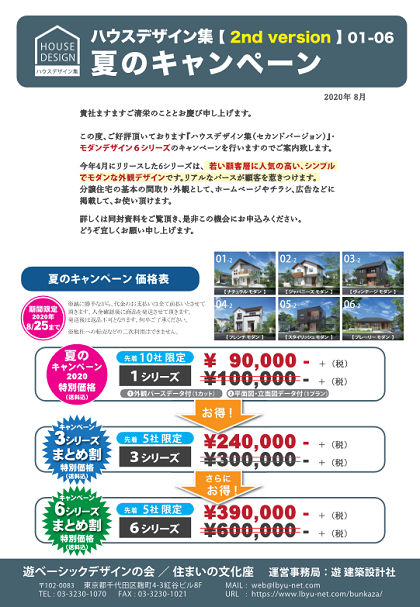 遊建築設計社が運営する遊ベーシックデザインの会(東京都千代田区)は、「ハウスデザイン集・2nd version(セカンドバージョン)」を対象にした夏のキャンペーンを実施する。期間は8月25日まで。