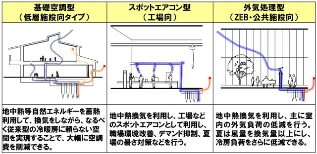 同システムには、基礎空調型(低層施設向タイプ)、スポットエアコン型(工場向)、外気処理型(ZEB・公共施設向)があり、それぞれ地中熱換気を利用して、環境改善および空調費等を削減する効果が期待できるという。