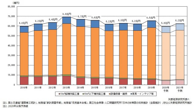2020年の市場規模は同9.0%減の5.9兆円、2021年は同4.8%増の6.2兆円と予測する。新型コロナウイルス感染拡大に伴う緊急事態宣言発令のマイナス影響を加味する一方、テレワークが推奨されるなかで職住融合型リフォームや郊外の中古住宅需要の増加といったニューノーマルに対する需要のプラス影響も期待される。