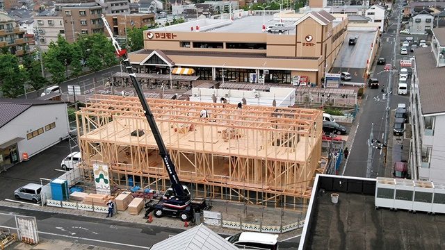 現在は、同市内でツーバイフォー工法により5階建て・延べ床面積約370㎡の木造ビル(2時間耐火建築物)を、店舗、事務所、住宅の複合施設として、9月上旬の完成・引き渡しに向けて建築中だ。