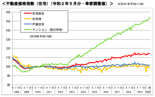 国土交通省は8月28日、今年5月分の不動産価格指数(2010年平均を100として算出)を公表した。「住宅総合」は前月比0.1%減の114.5(前年同月比0.1%減)、「住宅地」は同1.4%減の98.5、「戸建住宅」は同0.1%減の101.6、「マンション(区分所有)」は同1.3%増の154.6だった。