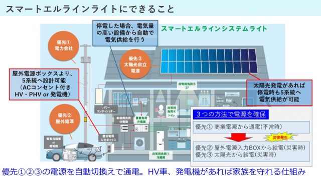 日東エルマテリアル(大阪市)は、停電時にHV車などの電気を宅内利用に自動で切り替えられる給電システム「スマートエルラインライト」を発売した。