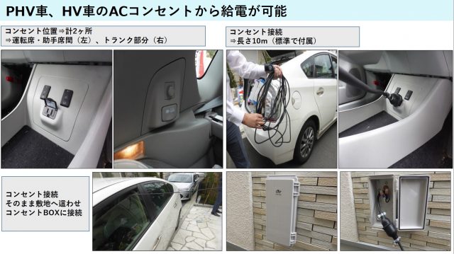 停電の際には、商用電源からHV・PHV・EV車からの給電に自動切り替え。HV・PHV・EV車のACコンセントから屋外電源入力ボックスにケーブルでつなぐことで、あらかじめ指定しておいた宅内の5系統に給電し、スマホの充電やWi-Fi接続、冷蔵庫、照明など最大100V/1500Wの電気を使うことができるとする。