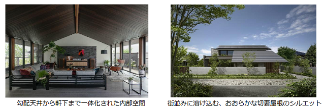 同住宅では、勾配天井から最大2.7mの天井高サッシを通じて、勾配軒下まで連続する「勾配クリアビューデザイン」と、最大8m×10mの「勾配大空間」を提案。コロナ禍により自宅で過ごす時間が増えた「Newnormal時代」において、大きな屋根に守られた安心感と、外とゆるやかにつながる広大な空間が、より豊かな自宅時間を実現するという。建物外観は大胆で洗練されたデザインの切妻屋根が特徴となっている。