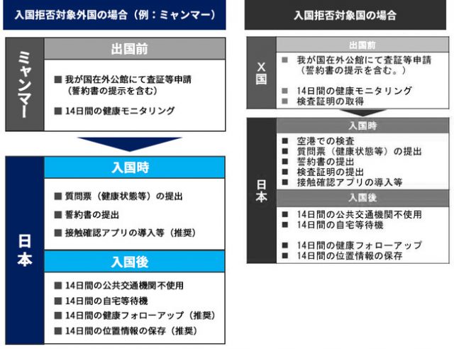 今回往来が再開される対象者は、技能実習生および特定技能人材を含む、ビジネス上必要な人材等。ミャンマーは新型コロナ感染拡大に伴う入国拒否の対象国でないことから、レジデンストラックによる入国に対して、出発前のPCR検査と陰性証明書、到着時のPCR検査が免除となる。ただし、現行の水際措置である14日間の公共交通機関不使用および自宅等待機については、感染防止のため実施の対象となる。