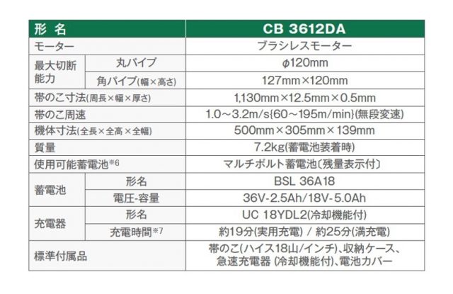 コード付き従来機種と比べ、約6倍の切断スピードと約1.2倍の帯のこ寿命を実現。1充電あたり電線管(Φ38.1×1.4mm)を約300回、配管用鋼管(Φ48.6×3.5mm)を約30回切断できるとする。
