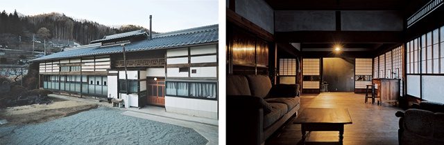 左:宿泊施設「旅と裸足」の外観。寺子屋として使われていたこともあり、倉庫や押し入れには古書や当時の教科書、筆記用具などが多く残されていた 右:古民家の情緒あふれる居心地のいい空間が、周辺の自然環境と相まって持続可能なエコな暮らし方の魅力を感覚的に伝える