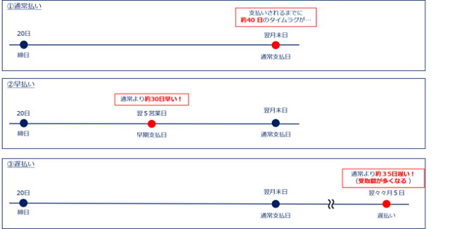 同サービスは、同社とインベストデザイン(東京都千代田区)が展開する発注者と受注者をつなぐ決済プラットフォーム。受注企業は発注企業の与信で利用することができ、報酬を受け取るタイミングを「通常払い」「早払い」に加え「遅払い」の3つから選べるようになった。今回導入された「遅払い」は、報酬の受取日を約65日遅らせることで、受取額に報酬額の1%が上乗せされるシステム。同社は、受け取りタイミングを3つにしたことで、資金繰りの改善策の新たな選択肢を提供するとしている。