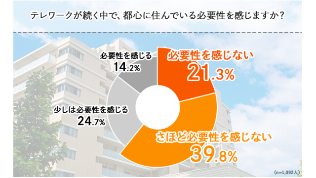 フリースタイル(東京都江戸川区)はこのほど、1都3県で持ち家に住み、かつテレワーク中の人を対象に「テレワーク中の住まいに関する調査」を実施し、その結果を発表した。新型コロナ感染症の影響でテレワークが続く中、都心に住んでいることに必要性を感じるか尋ねたところ、6割以上の人が「必要性を感じない」(21.3%)、「さほど必要性を感じない」(39.8%)と回答した。