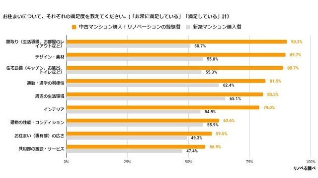 リノべる(東京都渋谷区)はこのほど、同社にて中古マンションを購入しリノベーションを行った人を対象に、住まいへの満足度や入居後の変化について調査を実施し、その結果を発表した。住まいの満足度としては、「間取り(生活導線、部屋のレイアウトなど)」(90.3%)、「デザイン・素材」(89.7%)、「住宅設備(キッチン、風呂、トイレなど)」(88.7%)の3項目がそれぞれ約9割と、特に高かった。