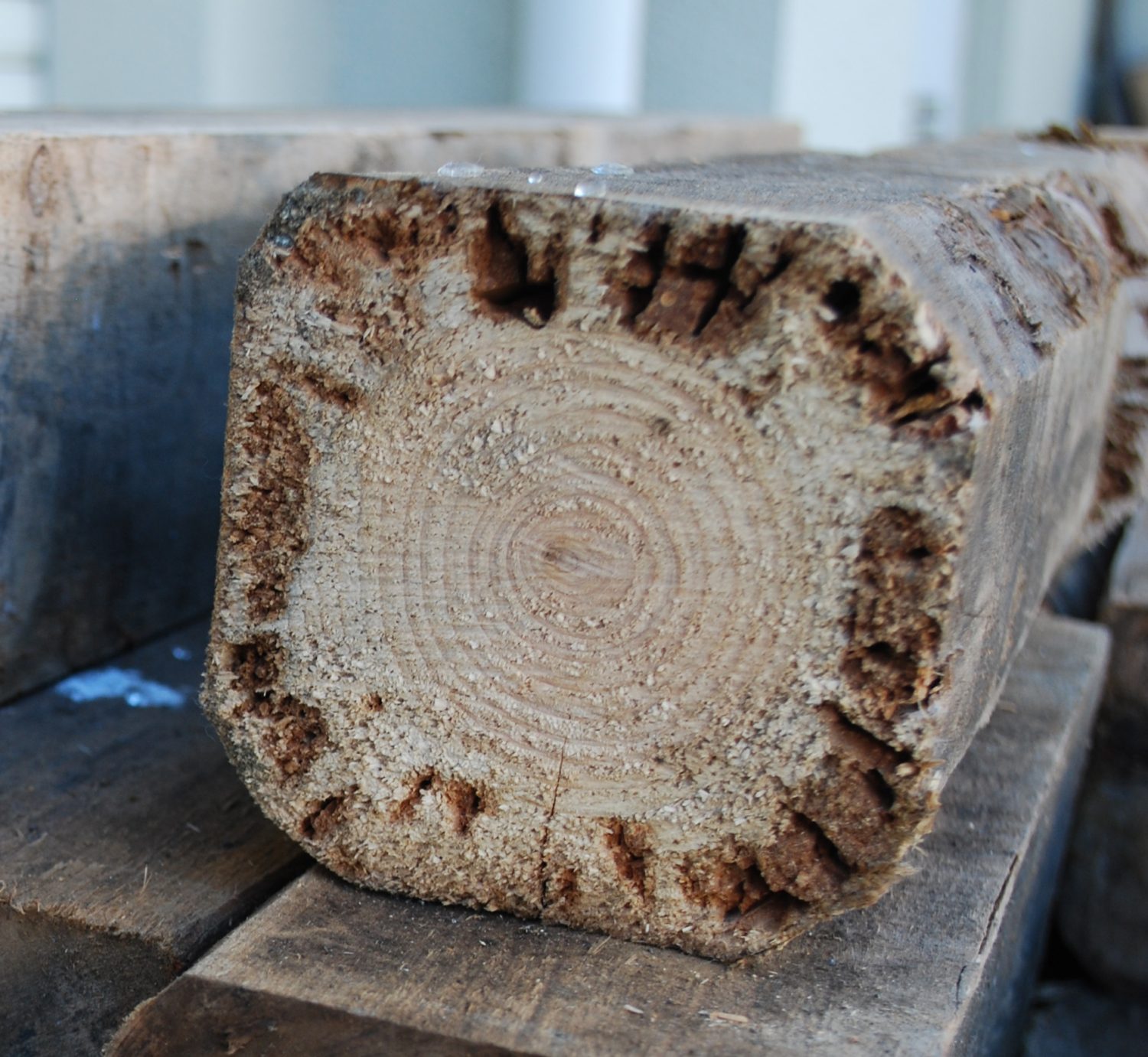 また木材は材によって腐朽しやすさが異なる。一番影響を受けるのが辺材と心材による違いだ。木材腐朽菌が好むのは辺材であり、心材は比較的腐朽しづらい。