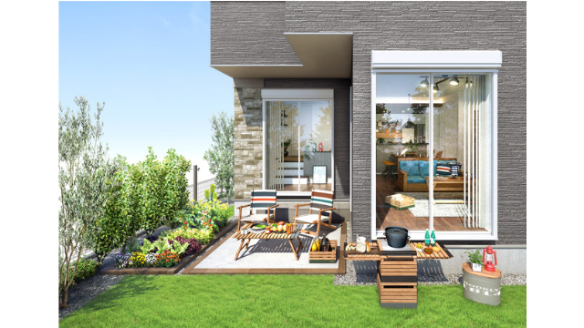 「スタイルゲート 東京・秋津町」は、全邸、敷地面積120m2以上。家庭菜園やバーベキューなどができるゆとりある庭やテラスを用意している。また、リビングで家族との団らんの時を過ごしながらも、プラスαのスペースでそれぞれの趣味や仕事、勉強などができるワークスペースも設置。庭に面する窓を全開にすれば、リビングと庭が心地よくつながり、憩いの空間がより開放的なものになる。リビングは天井高2.7mと開放感があり、天井にデザインクロスとダウンライトを採用したハイオープンキッチンや、リビングとキッチンの天井高低差を活用したコーブ照明が優しい室内空間を作り出している。