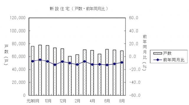 国土交通省は9月30日、8月の新設住宅着工戸数を発表した。前月に続き、持家・貸家・分譲住宅の全分野が減少し、全体で前年同月比9.1%減の6万9101戸、14カ月連続の減少となった。7万戸割れは8月の着工戸数では2009年8月の5万9749戸以来となった。季節調整済年率換算値は前月比1.0%減の81.9万戸で先月の増加から再びの減少となった。
