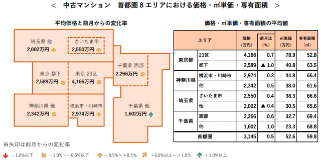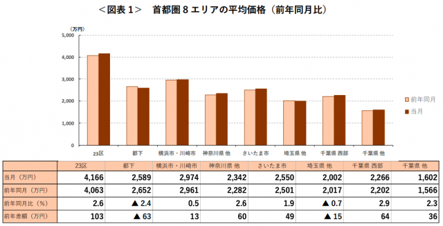 首都圏全体の1戸あたり平均価格は3145万円で前月比0.5%上昇。エリア別では、「東京都下」、「埼玉県他」以外の6エリアで前月を上回った。特に「東京23区」は4166万円(前月比+0.7%)となり、3カ月連続で最高額を更新した。