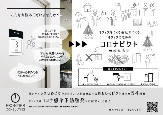 フロンティアコンサルティング(東京都中央区)は10月7日、新型コロナウイルス感染防止を念頭に置いた、ワークスペース向けピクトグラム「コロナピクト」54種類を無償配布すると発表した。新しい生活様式の実践において〈気づき〉を促す施策が必要との考えから実施するもの。同社ウェブサイト内でダウンロードできる。