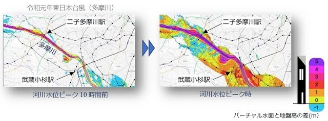 ハザードマップ等とは異なり、リアルタイムで河川水位・潮位と地盤高の差がわかるため、豪雨時の住民避難や企業の事業活動中断の判断、物流事業の交通渋滞リスク回避など、多様なニーズに応じた活用が期待できるという。