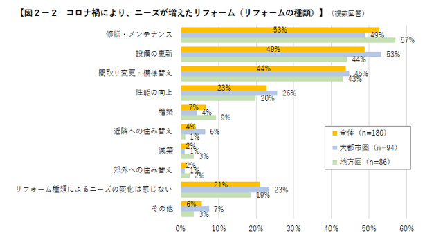 一般財団法人住まいづくりナビセンター(東京都中央区)はこのほど、同財団法人が運営するリフォーム事業者検索サイト「リフォーム評価ナビ」登録事業者を対象に、コロナ禍によるリフォーム需要の変化や、リフォーム事業者のIT活用状況に関する実態について調査を実施した。その結果、コロナ禍によりニーズが増えたと感じられるリフォームの種類トップは「修繕・メンテナンス」(53%)だった。次いで「設備の更新」(49%)、「間取り変更・模様替え」(44%)、「性能の向上」(23%)となった。また、少数だが「近隣への住み替え」も4%あり、その多くは大都市圏でニーズが発生している。