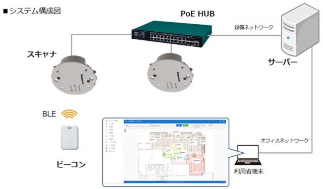 同システムは、BLE(Bluetooth Low Energy)発信ビーコン、専用スキャナ、専用サーバー、ネットワーク機器(PoE HUB)で構成。ビーコンの信号を複数の専用スキャナが受信し、その受信電波強度(RSSI)を専用サーバーで解析してビーコン位置を測位する。ビーコンの位置情報をフロアレイアウト画面へ表示することで、人やモノの位置情報データが表示され、スペースの活用度合い、人の交流、未活用スペースなどの見える化が可能となる。専用スキャナは、PoE HUBからLANケーブル1本で通信し、給電もされるため電源工事が不要。