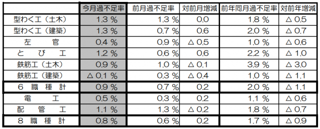 職種別の状況では、鉄筋工(建築)以外の職種で不足となった。不足が最も大きかったのは型わく工(土木)と同(建築)で、ともに不足率1.3%だった。地域別では、沖縄で均衡、中国で過剰、北海道、東北、関東、北陸、中部、近畿、四国、九州で不足となった。不足率の最大は北海道(3.6%)、ついで九州(2.1%)、東北(1.5%)、四国(0.5%)などとなった。