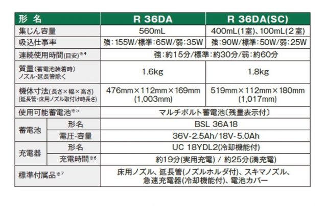 「R36DA」は、独自のマルチボルト蓄電池(36V↔︎18V)と高回転ブラシレスモーターを搭載したことにより、吸込仕事率を従来機より約3.9倍高めた155Wを実現。