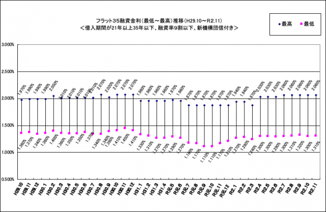 住宅金融支援機構(東京都文京区)が11月2日発表した、各金融機関の長期固定金利住宅ローン「フラット35」の11月分の金利は、主力の融資率9割以下・借入期間21年以上の場合で、年1.31~年2.06%だった。最低金利は2カ月ぶりの上昇となった。