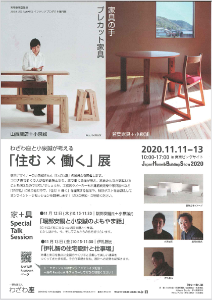 一般社団法人わざわ座(東京都東村山市)と家具デザイナーの小泉誠さんは、“わざわ座と小泉誠が考える「住む×働く」展”を、11月11日から13日に「ジャパンホームショー」新建新聞社ブース内(東京ビッグサイト)にて開催する。