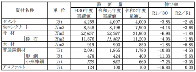 セメントは前年度比2.4%減の4000万トン、生コンクリートは同3.6%減の7900万m3、骨材は同1.8%減の2億1900万m3、木材は同5.8%減の850万m3、普通鋼鋼材は同4.5%減の1780万トン、アスファルトは同0.3%増の100万トンだった。
