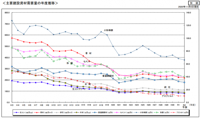 国土交通省は11月6日、2020年度の「主要建設資材需要見通し」を公表した。主要建材6資材のうち、アスファルト以外の全ての資材で前年度を下回る需要の見通しとなった。