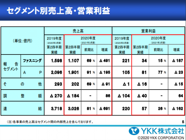 YKKグループ(東京都千代田区)は11月12日、2021年3月期第2四半期連結業績(累計)を発表した。住宅関連のAP事業は、売上高が前年同期比9.3%減の1901億9200万円、営業利益が同22.6%減の81億6200万円だった。