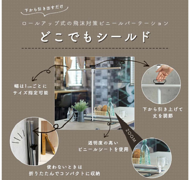 友安製作所(大阪府八尾市)はこのほど、ロールアップ式の飛沫対策簡易ビニールパーテーション「どこでもシールド」の販売を開始した。