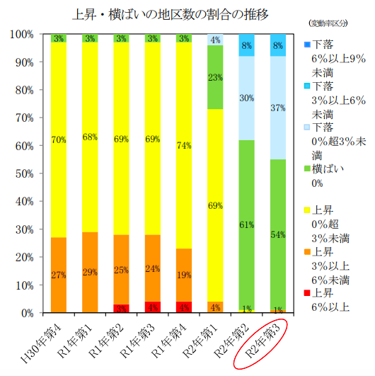 国土交通省は11月19日、主要都市の高度利用地等(全国100地区)における7月1日~10月1日(2020年第3四半期)の地価動向を調査した「地価LOOKレポート」を公表した。地価が上昇した地区数は前期並みの1地区、横ばい地区数は61地区から54地区に減少、下落地区数は38地区から45地区に増加した。