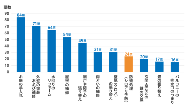 過去5年間に実施したメンテナンスの種類を聞いたところ、最も多かった回答は「庭の手入れ」(84人)だった。次いで「外壁塗装および補修」(71人)、「水回りのリフォーム」(64人)、「屋根の補修」(54人)となった。