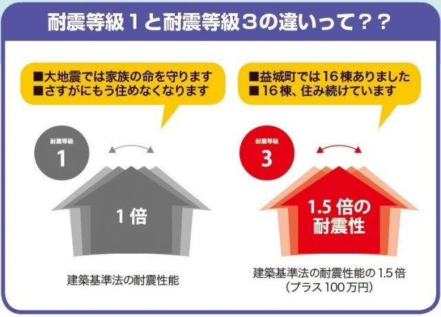 耐震等級は1から3まであります。耐震等級1は建築基準法で求めている耐震性能、耐震等級2は基準法の1.25倍の耐震性能、耐震等級3は基準法の1.5倍の耐震性能です。