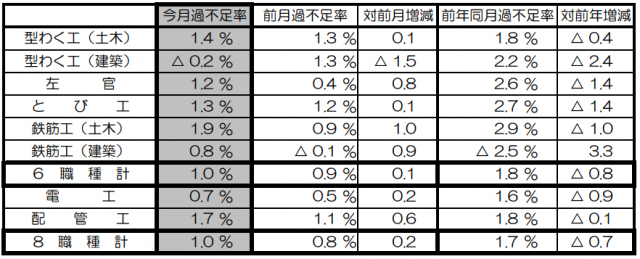 職種別の状況では、型わく工(建築)以外の職種で不足となった。不足が最も大きかったのは鉄筋工(土木)で、不足率は1.9%だった。地域別では、沖縄で均衡、その他で不足となった。不足率の最大は北海道(3.2%)、ついで東北(2.0%)、九州(1.7%)、四国(0.9%)などとなった。