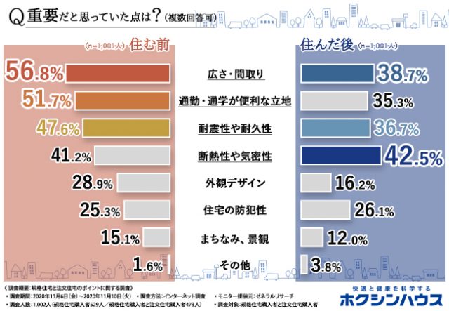 「住む前と住んだ後で重要だと思う点」について、規格住宅・注文住宅の全購入者に聞いたところ、「住む前」の上位は「広さ・間取り」(56.8%)、「通勤・通学が便利な立地」(51.7%)、「耐震性や耐久性」(47.6%)なのに対し、「住んだ後」の上位は「断熱性や気密性」(42.5%)、「広さ・間取り」(38.7%)、「耐震性や耐久性」(36.7%)となった。