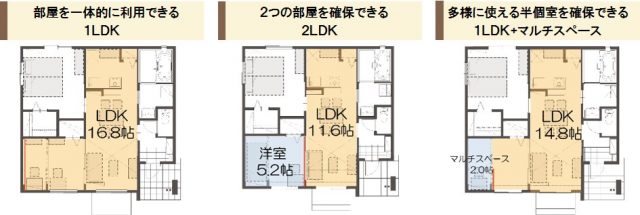 ココダテワンズは、同社初となる平屋戸建て賃貸住宅商品。共働きで子どもを意識的に持たないDINKs(ディンクス)や、子どものいるファミリーからシニアまで幅広い層をターゲットとしており、家族が集まるリビングを居室の中心に配置した「センターリビング」の間取りを採用。また、コロナ禍の影響で変化する居住者の価値観に対応するため、可動建具の「アートパネル」により空間を仕切ることで、1LDK~2LDK、1LDK+マルチスペースなど、幅広い生活スタイルに対応できるプランを採用した。