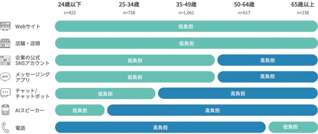 企業とのコミュニケーションチャネルに感じる「手間・負担感」の世代別傾向は、24歳以下の若年層では、新型チャネルへの抵抗感が低い反面、電話など人と人との対話が発生するチャネルを回避する傾向。65歳以上の高齢層は、電話を好む反面、新しいチャネルに対する忌避感が強い傾向が見られた。