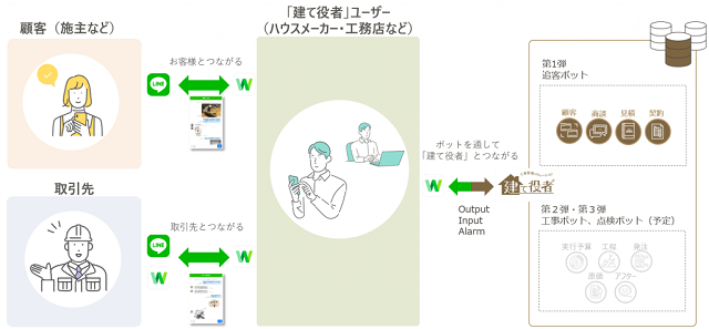 本連携による機能は、工務店やハウスメーカーなどの建て役者ユーザーにオプションとして提供される。今回は第一弾として「追客ボット」機能が提供され、ユーザーはLINEの使用感のままbot(ボット)と会話するような感覚で建て役者の情報を活用できるようになる。