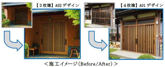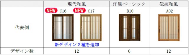 引戸のデザインは、「現代和風」12デザイン、「洋風ベーシック」6デザイン、「伝統和風」12デザインの計30デザインをラインアップ。現代和風に新デザイン2種を追加した。また、伝統和風には「4枚建」を新たに設定。既設の間口9尺・12尺に対応可能とした。さらに、2枚建の全てのデザインでランマ付が選択可能とするなど、暮らしや好みに合わせて玄関引戸が選べるよう、デザイン追加とラインアップの拡充を行った。