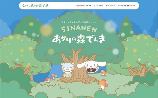 また、家庭向けの通常版「シナネンあかりの森でんき」販売に先駆け、同プランの応援隊長に就任したサンリオのキャラクター・シナモンロールが応援する特別プラン「シナモロールが応援する シナネンあかりの森でんき」の全国販売を開始する。電気料金は、管轄の旧一般電気事業者の従量料金メニューより従量料金単価が3~10%割引になるメニュー。そこに環境配慮活動のための費用として「CO2排出0メニュー料金:1.43円/kWh(税込)」「あかりの森プロジェクト料金:0.1円/kWh(税込)」と、特別プラン加入のための「サポーターズ料金」(200円、500円、1000円のいずれかのプランを選択)が追加される。