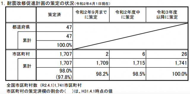 耐震改修促進計画の策定状況は、都道府県ではすべてで策定済み、市区町村では前年比0.2ポイント増の98.0%(1707市区町村)が策定済みだった。