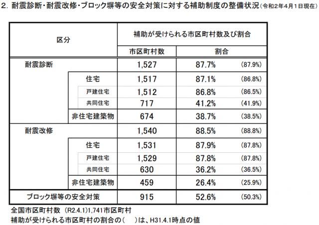 市区町村における耐震改修等に対する補助制度の整備状況では、耐震診断への補助制度が同0.2ポイント減の87.7%(1527市区町村)、耐震改修への補助制度が同0.3ポイント減の88.5%(1540市区町村)、ブロック塀等の安全対策への補助制度が同2.3ポイント増の52.6%(915市区町村)でそれぞれ整備済みだった。