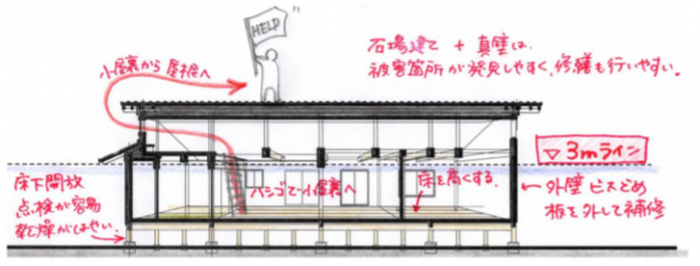すまい塾古川設計室の「熊本平野に建つ家」は、熊本県産材を用いて伝統工法の耐震性を確保しながら、災害対策も考慮した、地域に住まう大工や職人が家をつくる石場建てづくりの住宅。綾部工務店の「自然を楽しむ街の家」は、地域にふさわしい意匠と素材構成により、維持管理や耐久性の向上を目指し、伝統的な石場建てとダボ入り落とし込み板による手刻み木組みの住宅。門の「石垣の家」は、地域コミュニティーや行事などで集う半戸外的空間を設け、昔ながらの沖縄の原風景である屋敷林のフクギや石垣を生かした、景観に馴染む平家の石場建て木造住宅となっている。